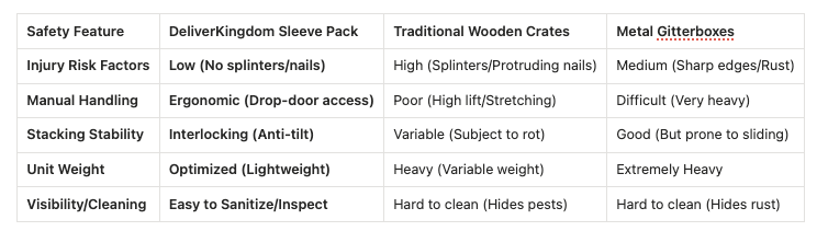 Le Pochette DeliverKingdom Sécurité avant tout Ce système est conçu pour atténuer les risques inhérents aux emballages industriels traditionnels, tels que les lourdes caisses en bois et les bacs métalliques aux arêtes vives. De nombreux entrepôts sont confrontés à la hausse des primes d'assurance et aux temps d'arrêt dus aux échardes, aux clous qui dépassent et à la pénibilité du travail liée à la manutention d'équipements lourds et non pliables. Ce système résout ces problèmes de sécurité en utilisant polymères légers mais à haute résistance et une finition lisse et sans échardes. Doté d'un conception ergonomique de porte rabattable Cela élimine la nécessité pour les travailleurs de se surétirer ou de se pencher dangereusement lorsqu'ils récupèrent des marchandises au fond du conteneur, améliorant ainsi directement les scores de sécurité au travail et le débit opérationnel de la logistique d'entreprise.
